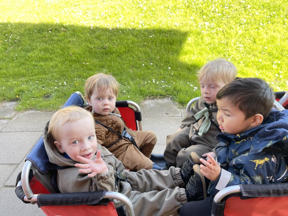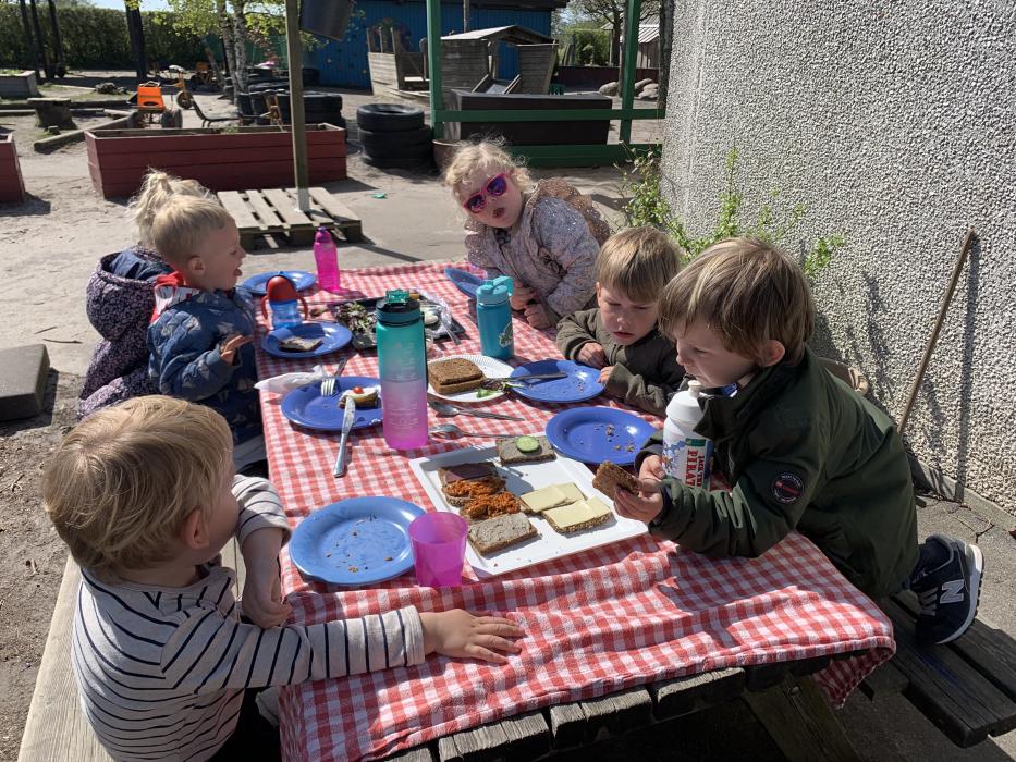 Idag har vi leget Bamsehospital. Tina kom med plaster og gazebind til os, og så puttede vi plaster på hinanden og forbandt hoveder, arme og bamser ind i gazebind. Vi hjalp alle hinanden med kram og pustede løs på de steder vi havde slåes os.