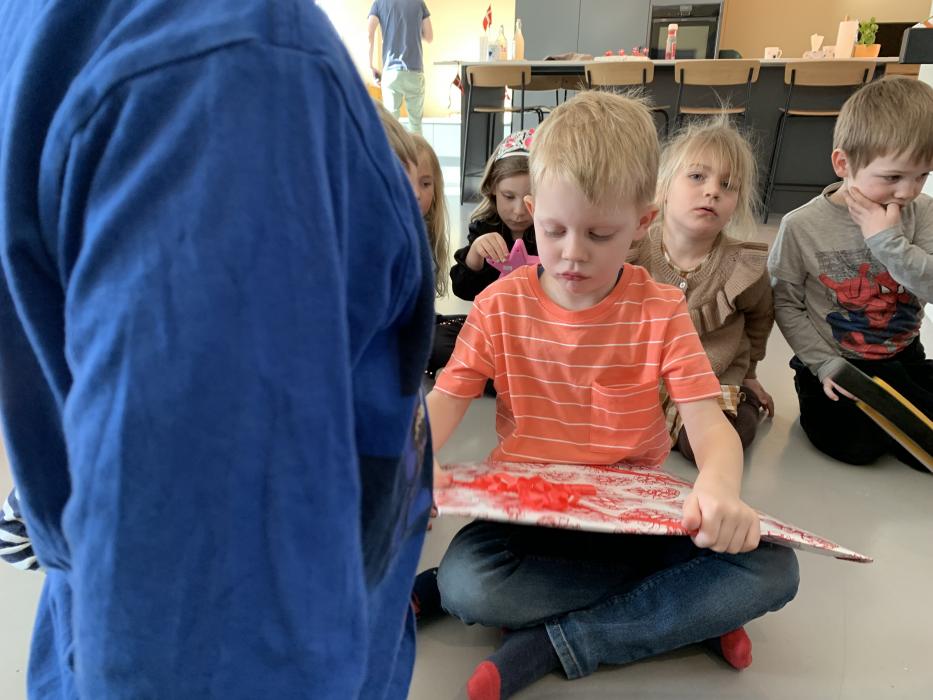 Idag har Mira, Vera og Alba leget på stuen, Vester og Frederik har malet fisk, Asta, Karla og Harvey har været ude at lege i regn og vandpytter, og Storm tog en formiddagslur.