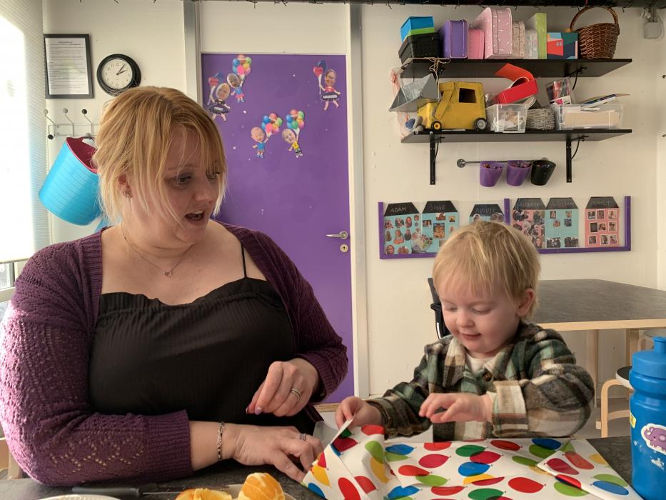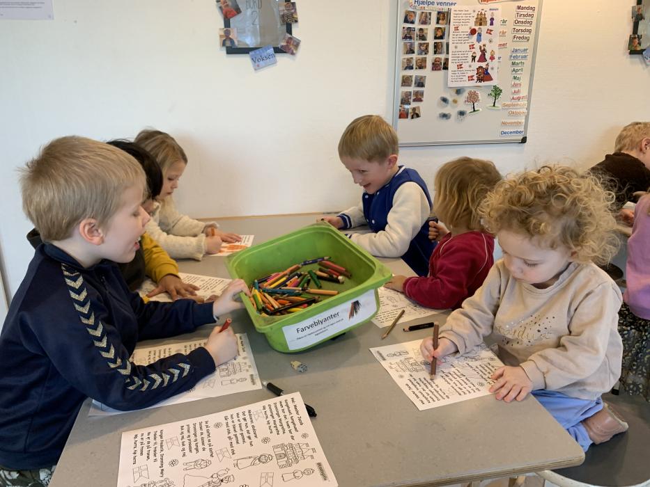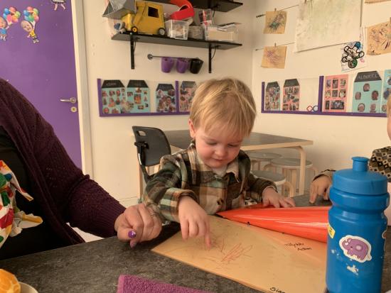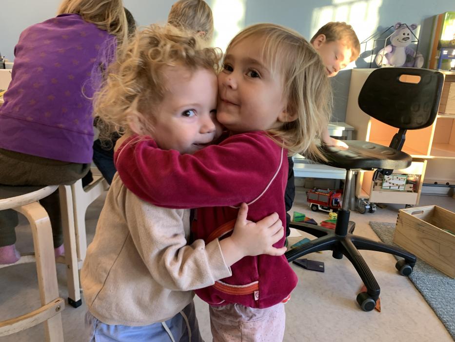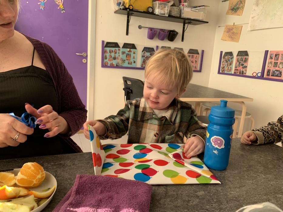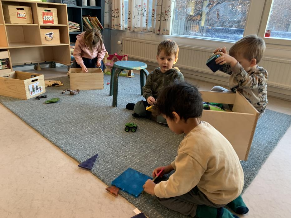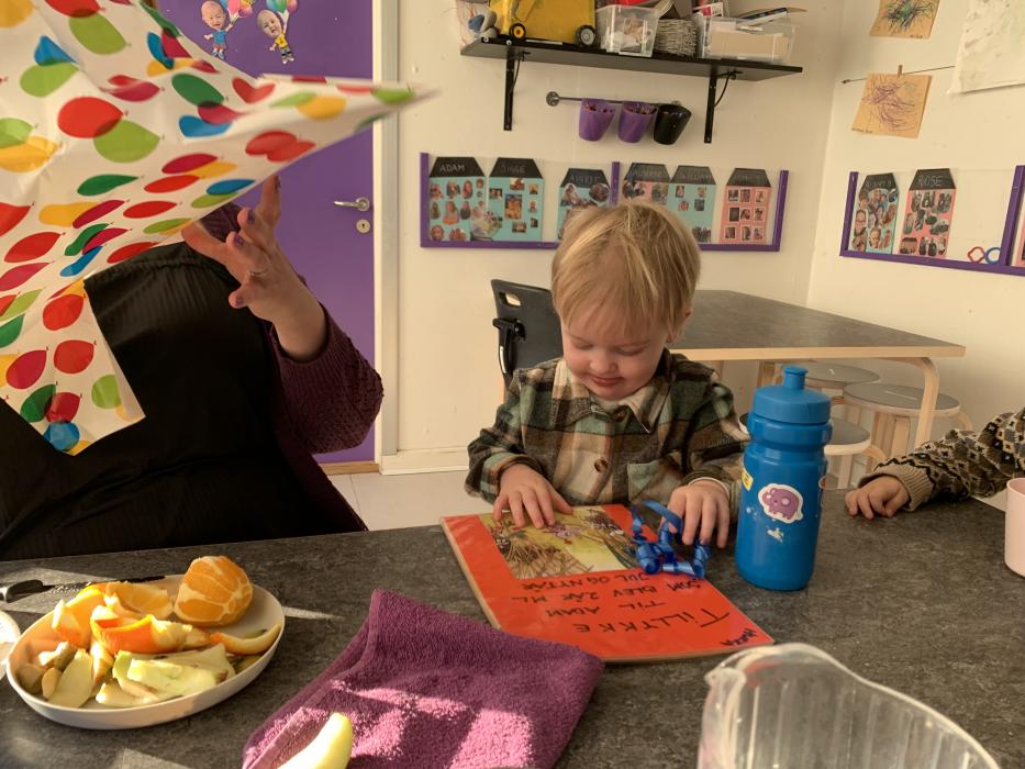 Idag har tepotten og Fyrtøjet spist både frugt og frokost sammen ude på legepladsen. Vi har sunget, kørt på motorcykler, set på køerne oppe fra bakken og hygget i sandkassen.