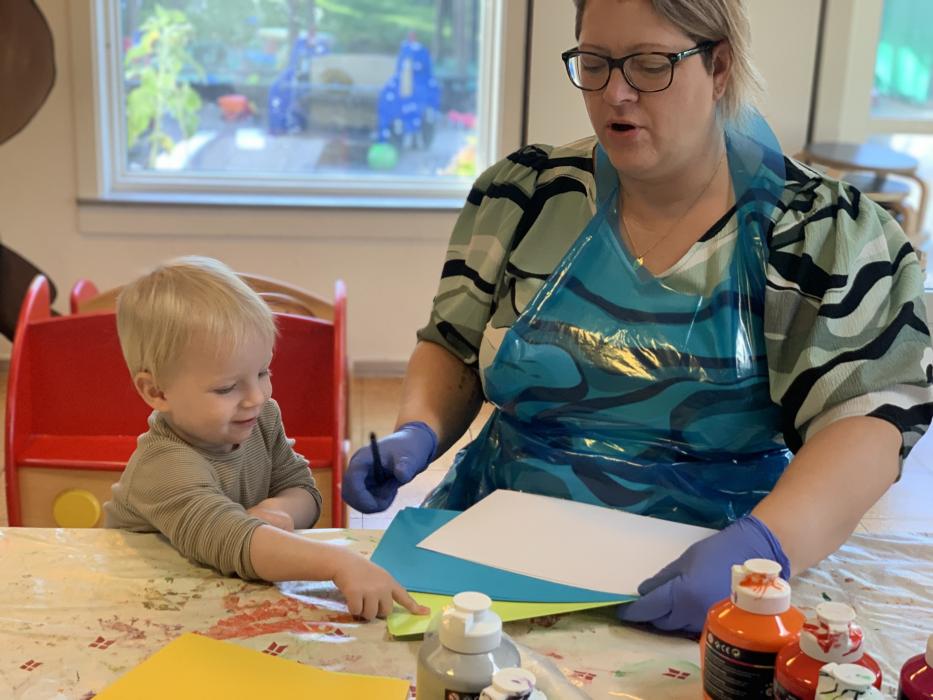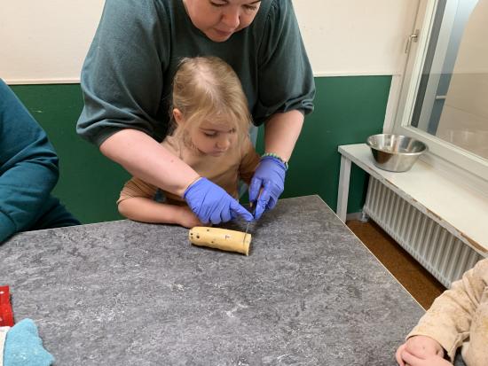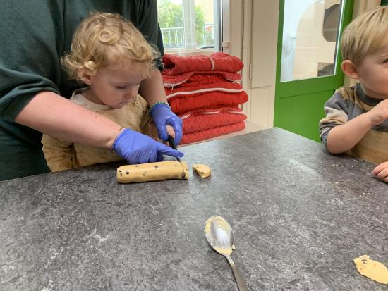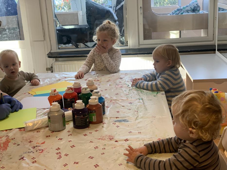 Vi har også set og lyttet til bordteater. Vi oplevede historien om de tre bukkebruse. Det var rigtig sjovt. Til frokost har vi spist lækker gulerodssuppe med pasta og her øver vi os i, selv at hælde mælk/vand i koppen. De er så gode til det!