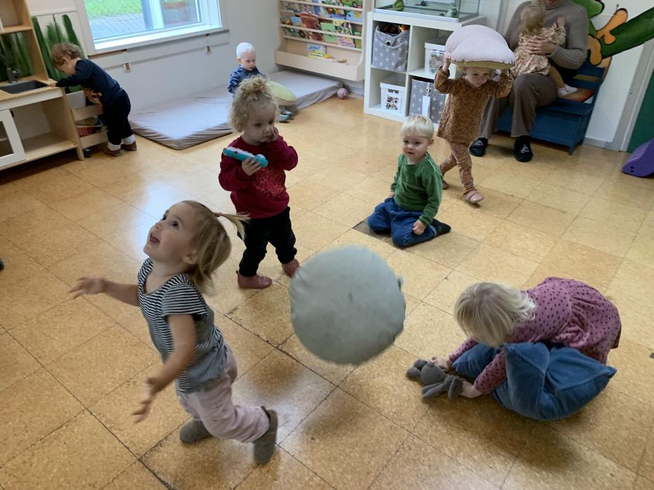 I dag sagde vi igen velkommen til vores nye pige Elia. Elia er lige flyttet til Dragør med sin familie. Ellers har formiddagen budt på huleleg, rockstjerneleg og lidt rytmik med rasleæg.