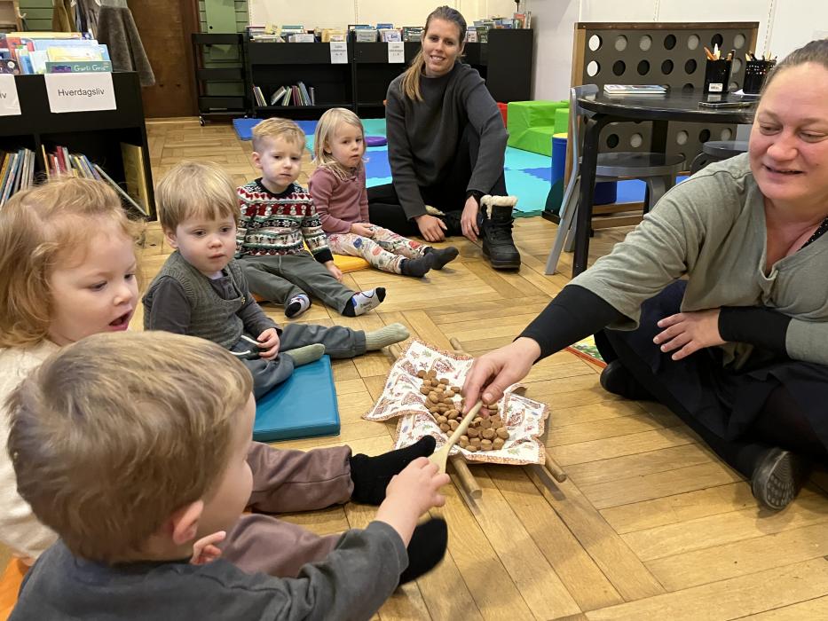 Idag har vi gået i Pippi Langstrømpes sko og gjort alt anderledes! Vi startede morgensamling med at sidde med ryggen mod hinanden og hilse godmorgen med rumpedans. Cecilie sagde godmorgen baglæns “NEGROMDOG” og der blev serveret “morgenmad” på bordet, hvor børnene kunne gå baglæns for at hente deres “morgenmad”. Bagefter dansede vi stopdans men idag skulle vi danse MENS musikken var på pause og stå stille MENS musikken spillede!