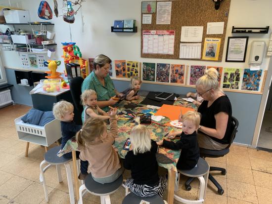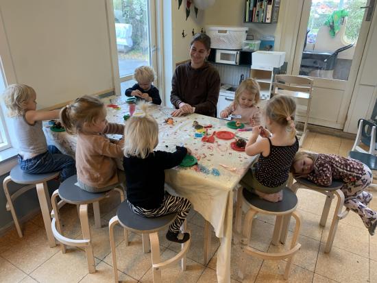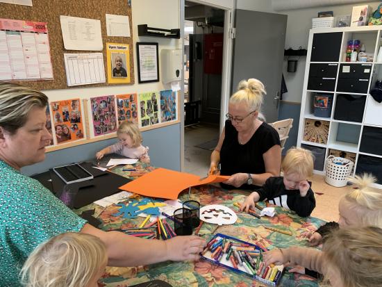 I dag var 3 børn på tur, I mens blev der lavet halloween-krea på stuen, leget med dukker, leget i køkkenet og leget med biler. Da vi kom hjem fra tur, blev der øvet at man selv skulle tá sit overtøj og støvler af, og finde sin egen plads.