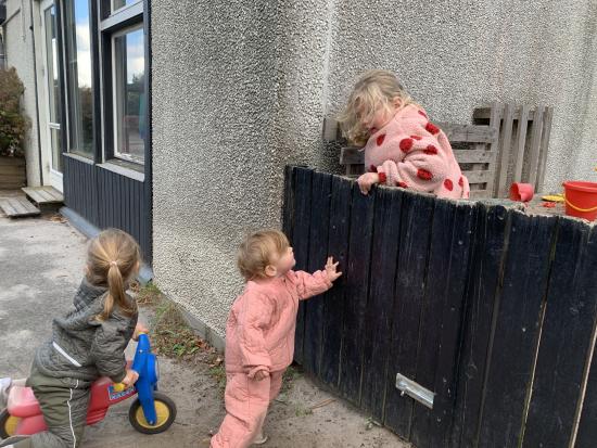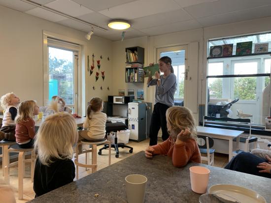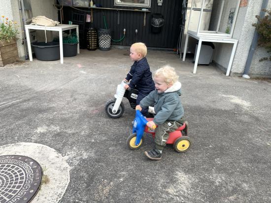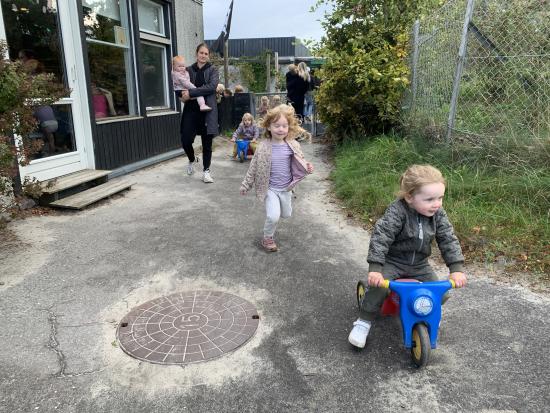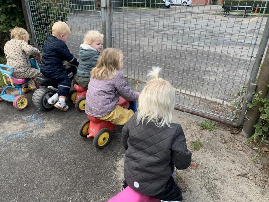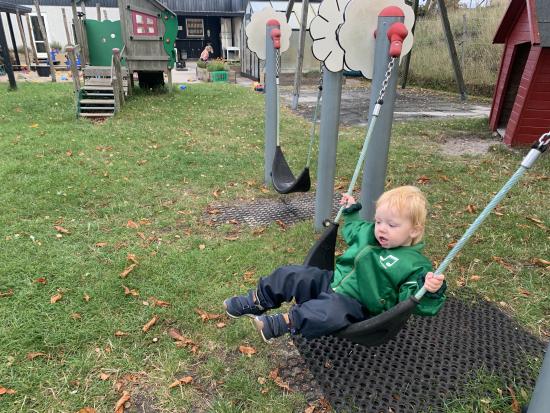 I dag sang vi vores sange til formiddagsmaden, et barn kommer op vælger et tal vi tæller til, og holder den sang på et skilt som vi ska synge. Bagefter var en lille gruppe i en sprog gruppe, og resten dansede, legede, øvede at skiftes til at bruge rutsjebanen og tegnede.