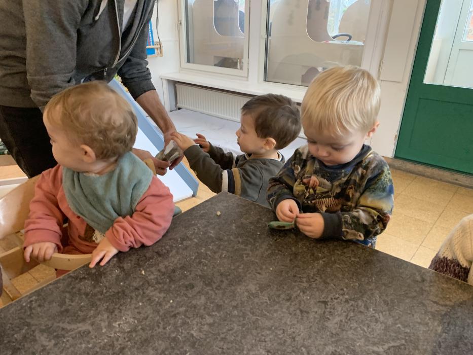 Idag har vi hentet haletudser på sengen i det lille vandhul. Vi har også plukket blomster og sat i vaser. Haletudserne er kommet i akvarie og nu er vi spændte på at følge med i deres udvikling! Syng meget gerne Bim Bam Busse derhjemme med jeres børn