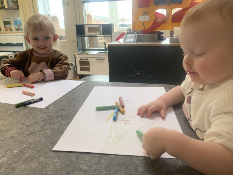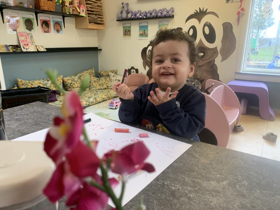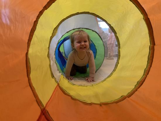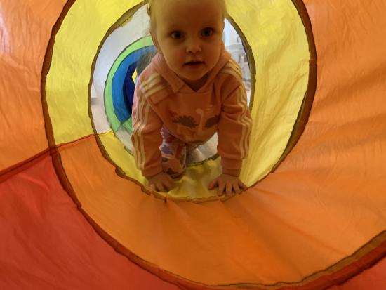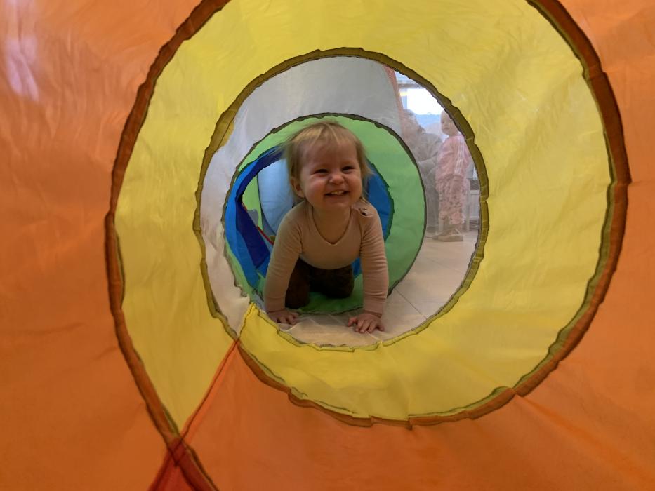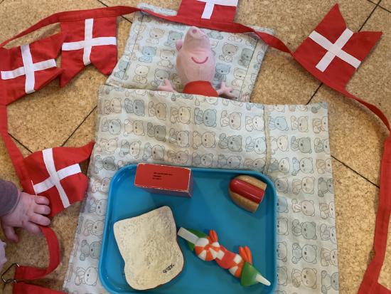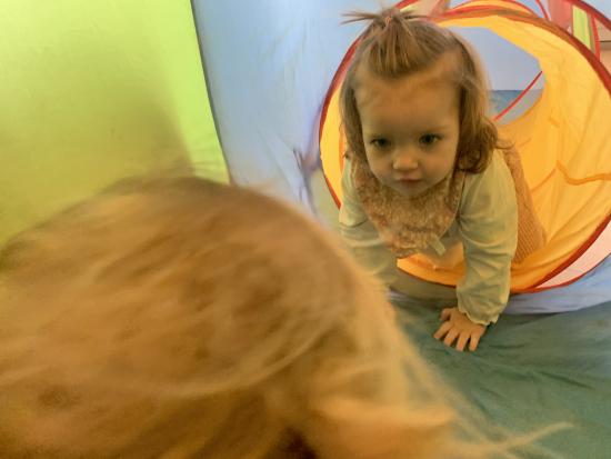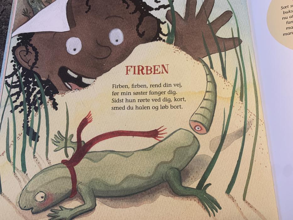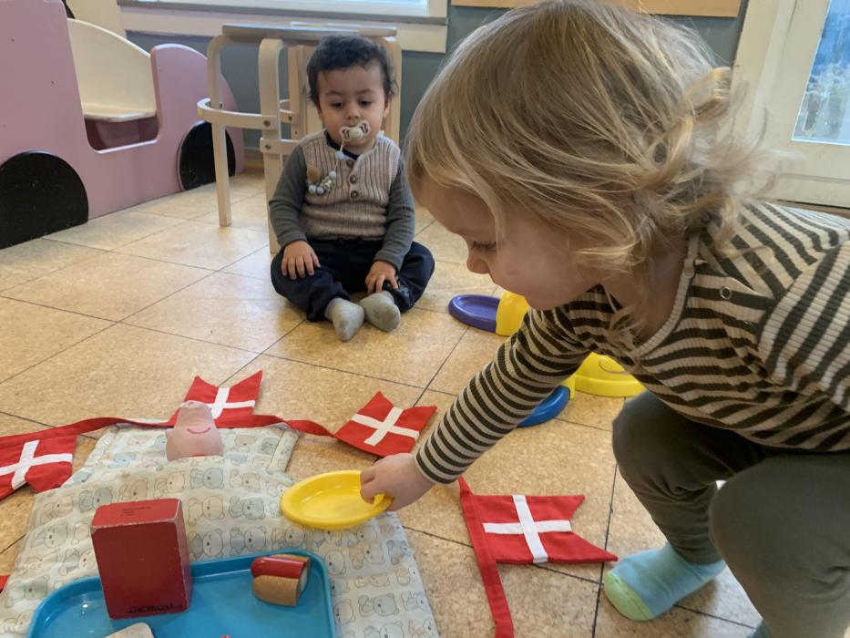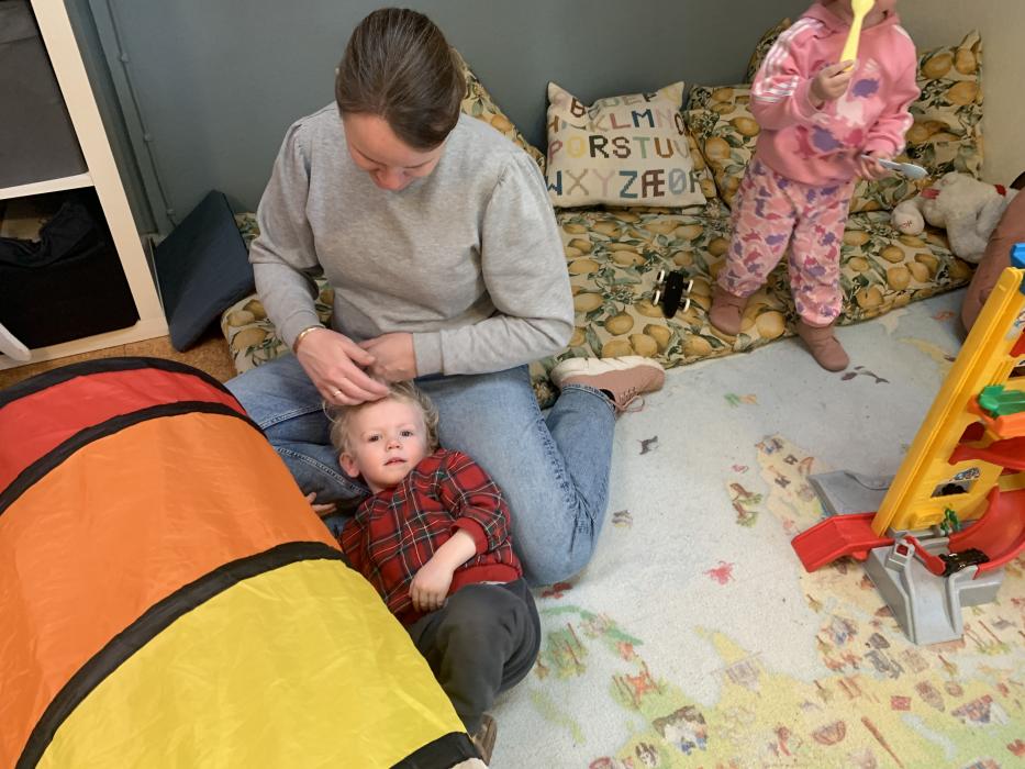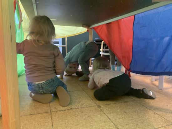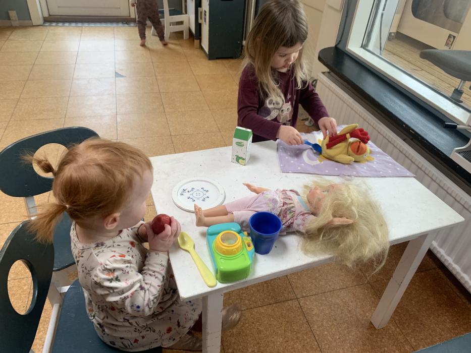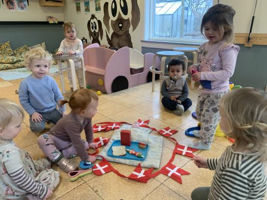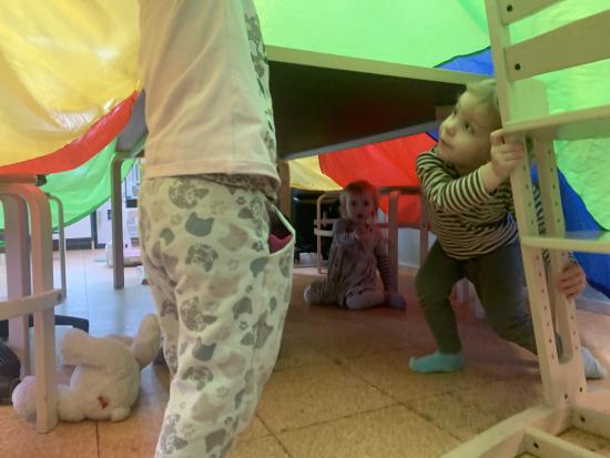 I dag har vi leget Påskefrokost, og øvet os i at sige skåååååål. Vi har holdt Gurli Gris’ 2 års fødselsdag med sang og gave. Vi har læst om firbenet der taber halen når den bliver forskrækket/bange og leget at vi selv taber vores hale når nogle siger højt BØH. Vi har leget gemmeleg, talt til tyve og fundet Lotte forskellige steder i huset. Og så lavede vi en hule under bordet vi kunne gemme os i.