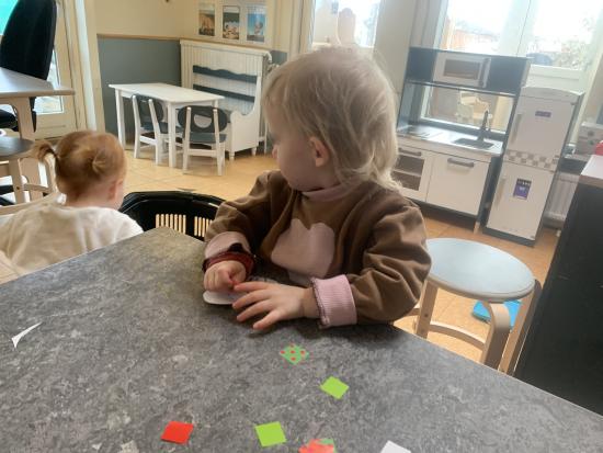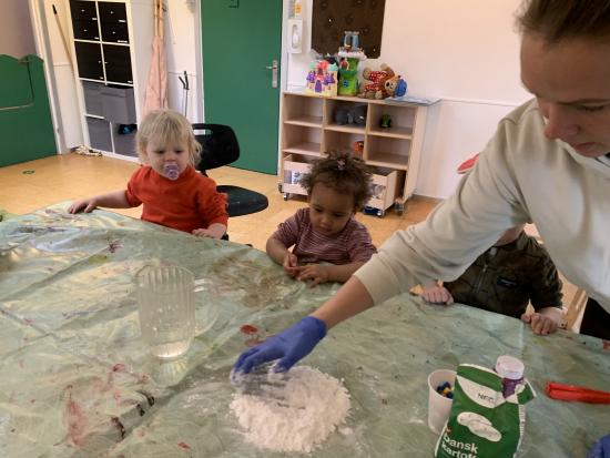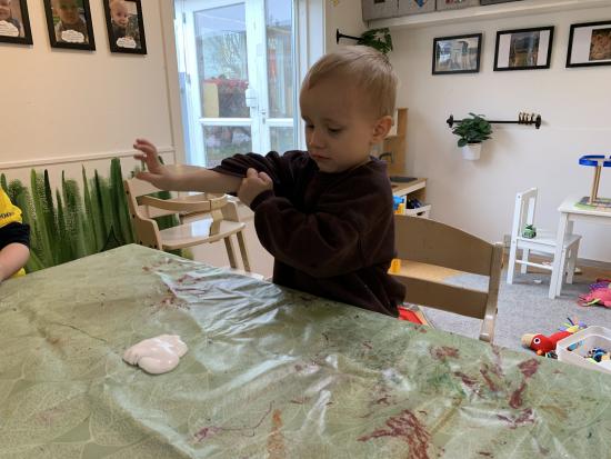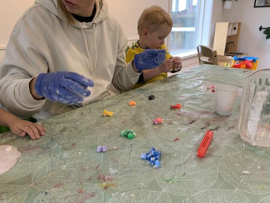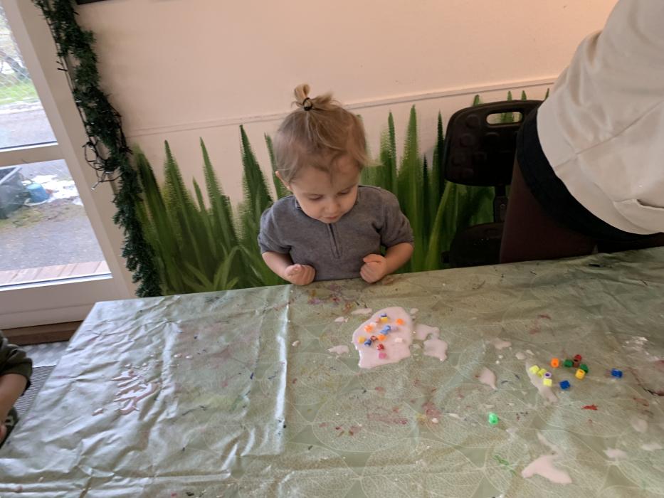 I dag har vi lavet elefant snot! Vi brugte kartoffelmel, vand, glimmer og perler! Da vi havde lavet nogle store bolde og lagt perler ind i dem, så skulle vi finde de farver Nikoline sagde. Også lagde vi alle farverne i en bunke hver. Det gik hele formiddagen med, ej hvor var det sjovt at bruge sine fingre til at forme elefantsnot :)