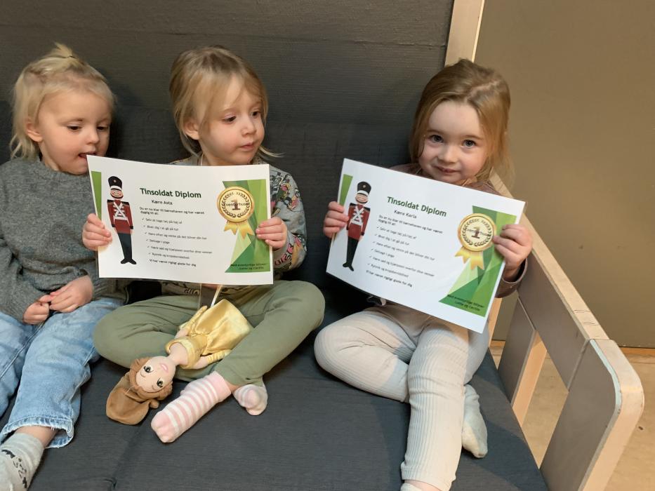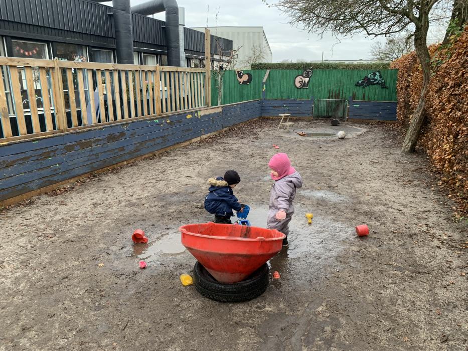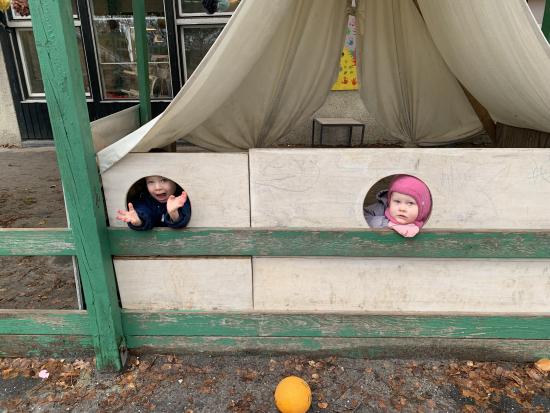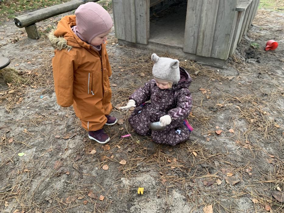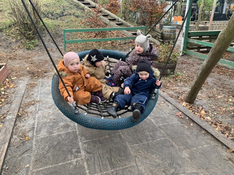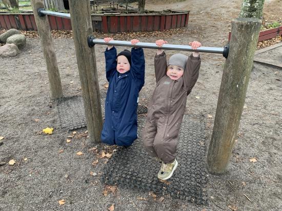 I dag var alle, store og små en tur på legepladsen og lege i det flotte vejr. Der blev gynget, hvor nogle skubbede hinanden på gyngen. Der blev leget i sandkassen og den store rutsjebane var et særligt stort hit i dag for alle. Husk navn i børnenes nye fine overtøj, det er svært for os at gætte hvem der ejer hvad, når vi tager alt overtøjet ind på stuen. Overtøj og fodtøj står i 2 spande på bænken i garderoben, så der kan i findes jeres barns overtøj når i henter i dag.