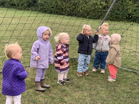 Idag gik vi over og legede på børnehavens store legeplads. Vi rutsjede, legede i legehus, klatrede og lavede sandkager.