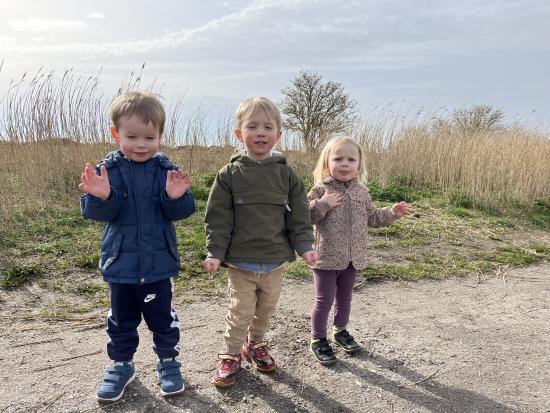 I dag var 3 børn på en gåtur ned til stranden. Der blev løbet om kap, samlet ting, mødt en hund og talt om stort og småt på turen. Derhjemme legede resten på stuen. De blev læst i bøger, leget dyr, i køkken og med frisørting.