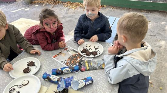 Vi har lavet spiselige halloween edderkopper i dag. Uhyggeligt lækkert :)