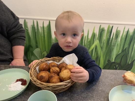 Idag havde Villum æbleskiver, syltetøj og flormelis med til alle vennerne, så der blev rigtig hygget igennem til formiddags mad. Villum havde også pebernødder og en julesang bog med, 1000 tak!