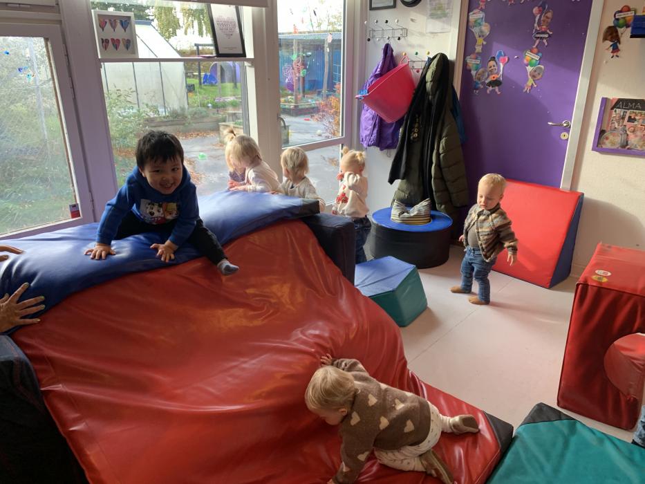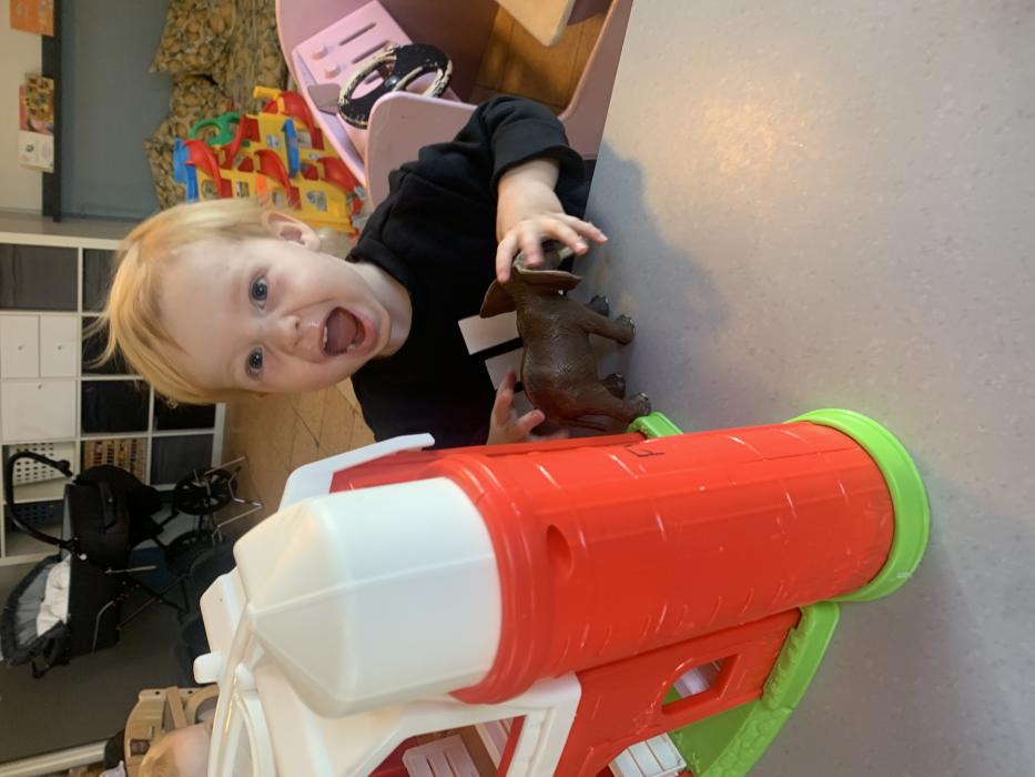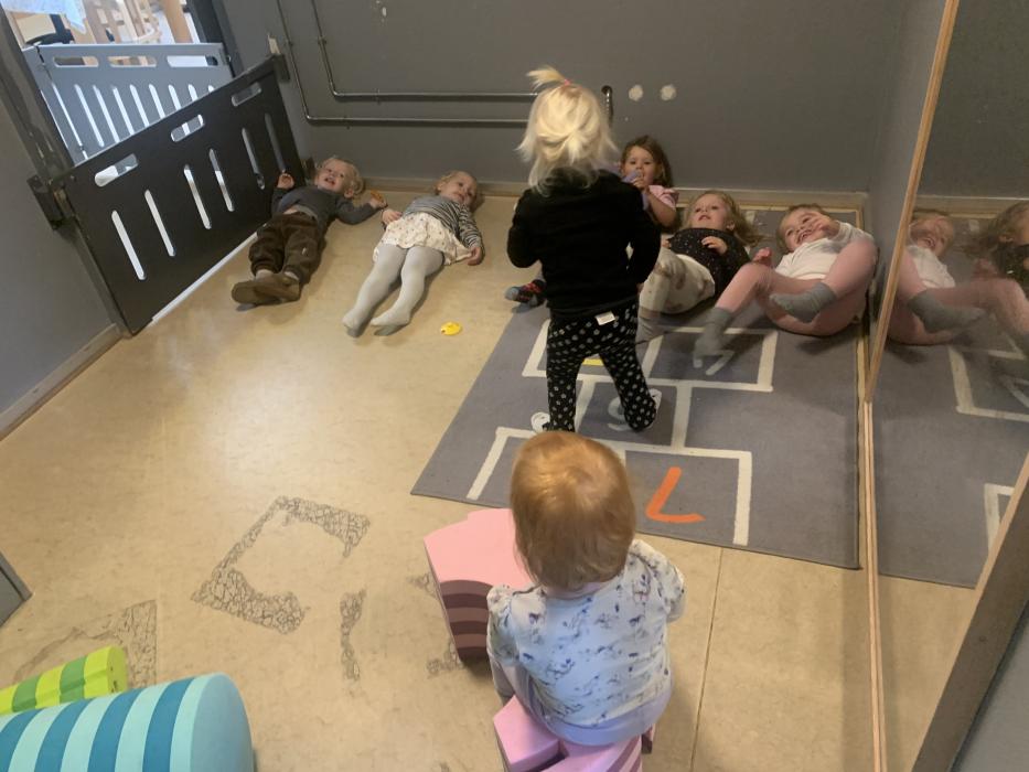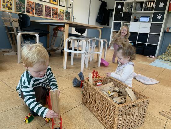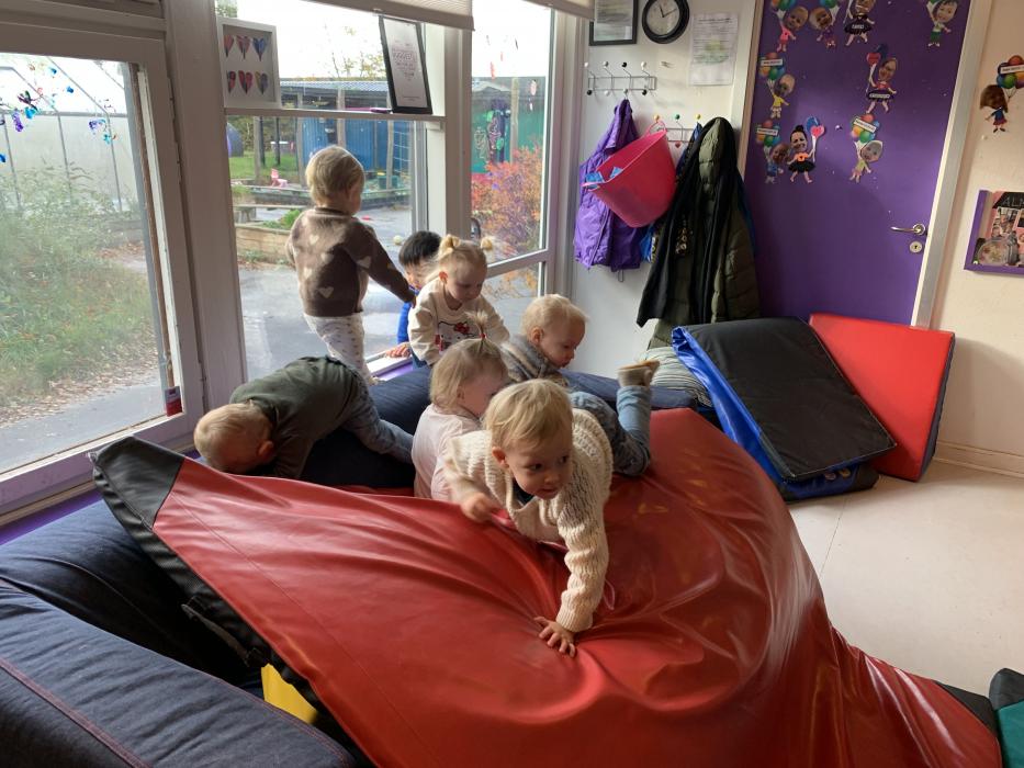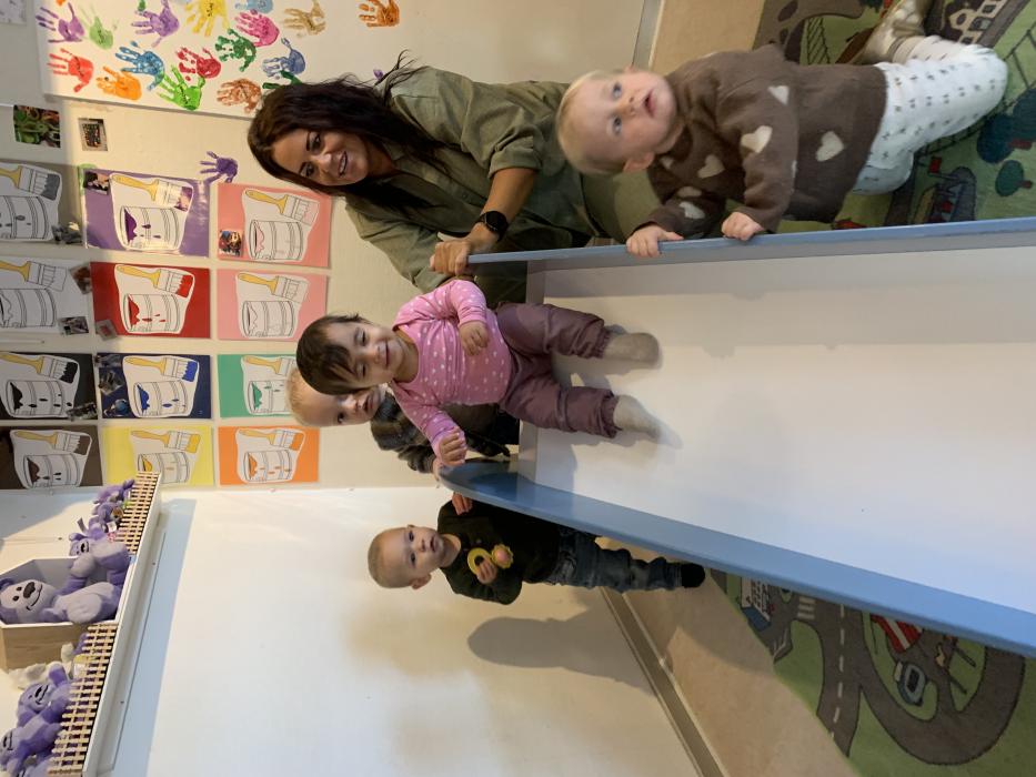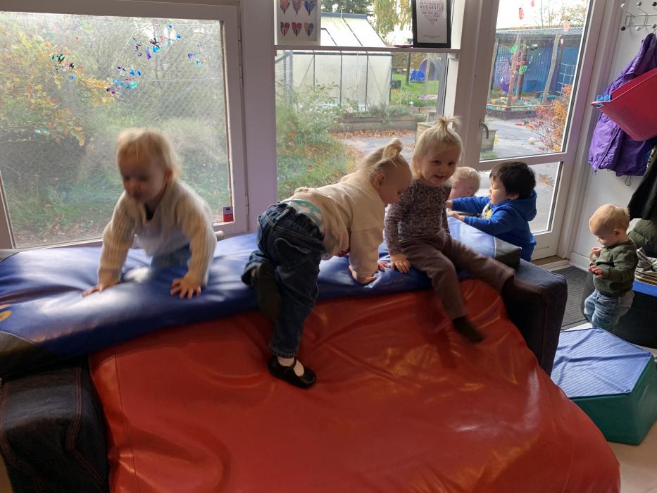 så har vi bygget en stor rutsjebane, som børnene har haft en fest med at rutsje ned af:) I denne forbindelse fik vi øvet at “vente på tur” og stå i kø - det var lidt svært, men i sær de store på stuen fangede det, og var så dygtige til at vente:)