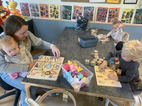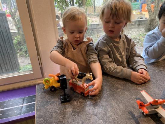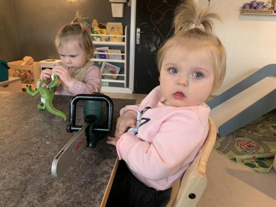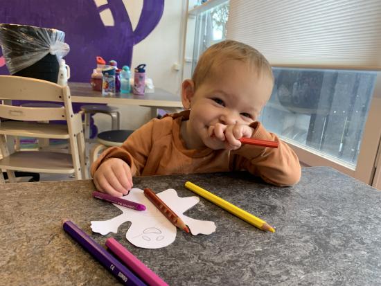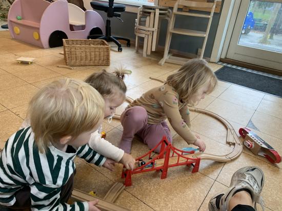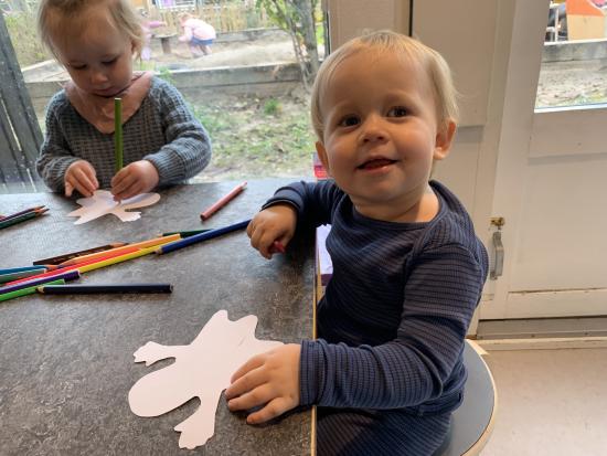 I dag til morgensamling sang vi sange. Børnene kommer skiftevis op og vælger et tal, vi taler om tallets farve, vi tæller og så synger vi den sang som barnet viser på skiltet. Bagefter legede vi med modelervoks, og med legetøjet på stuen.