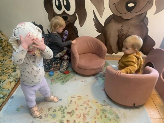 Inde på stuen blev der danset til musik, leget med biler, og nogle gik i køkkenet og lavede mad:(