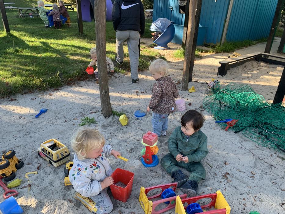 Ella, Bastian, Sander, Viggo, Andrea, Villy, Christina og Daniel har været ude på en regnvejr gå tur. Selvom det ikke regnede, så var der en masse vandpytter som var så sjove at hoppe i. Frida, Vester og Frederik har leget på stuen.