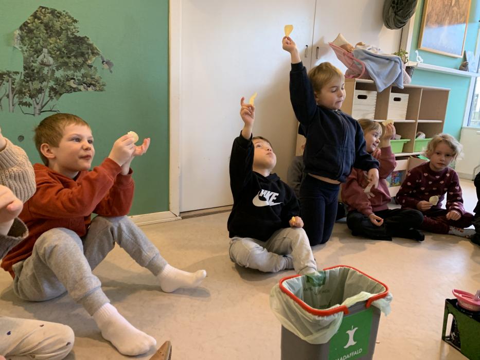 I dag skulle Rued, Otto, Rose, Emily og Georg, ud og se om de kunne fange vinden! Der blev løbet rundt med plastikposer. Marianne fangede luften i den store pose og så skulle vi se om vi kunne katapulterer forskellige stykker legetøj. Den første ting var en Kaj bamse…. Marianne fik sendt Kaj flyvende med så stor kraft, at pose gik i stykker og luften stak af! Knude på, og prøve igen. Vi prøvede med lette ting, som en Lego klods og et lille tog.