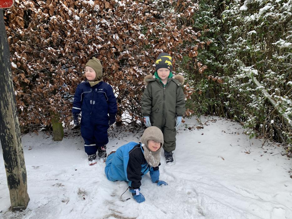 I dag skulle Tinsoldaterne en tur ud i trafikken. Vi gik til lyskrydset og gik over for Grønt lys mange gange. Det var spændende at skiftes til at trykke når der var rødt og så se det skifte til grønt. På vejen derhen blev vi mødt af en sød lille kat, som gerne ville kæles af alle børnene på én gang. Vi kunne rigtig høre den spinde. Vi lavede også hoppe leg og løbeleg. Det er bare skønt at bruge kroppen. Tilbage i vuggestuen har vi fået frikadeller med bønner og rugbrød og remoulade.