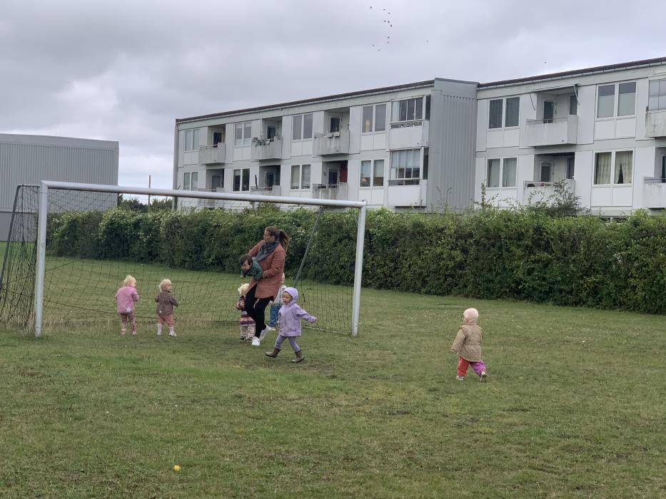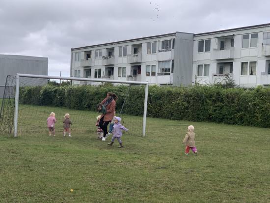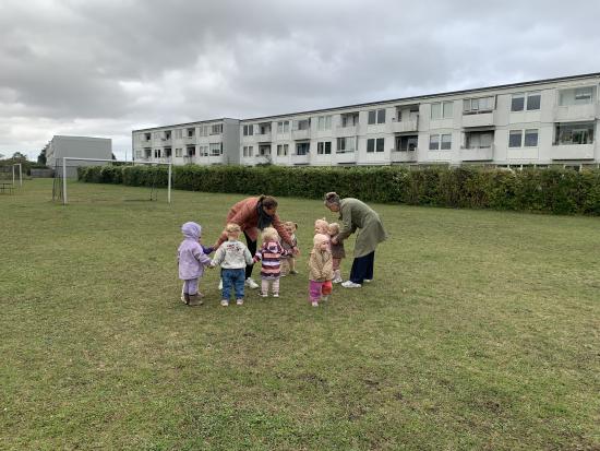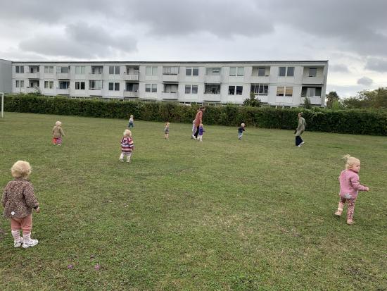 I dag var vi ude og gå en tur. Vi sluttede af på det grønne areal hvor alle blev “sluppet fri”. Alle løb i blæsten og synes det var sjovt da det begyndte at småregne. Vi sluttede af med at alle selv skulle øve sig i at tage sine egne sko af. Hvis man syntes det var lidt svært, fik man hjælp af sine venner. I dag var der en del der ikke havde navn i sit overtøj, så hvis man ikke kan finde det, ligger det i glemmekassen ved vinduet i garderoben.