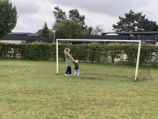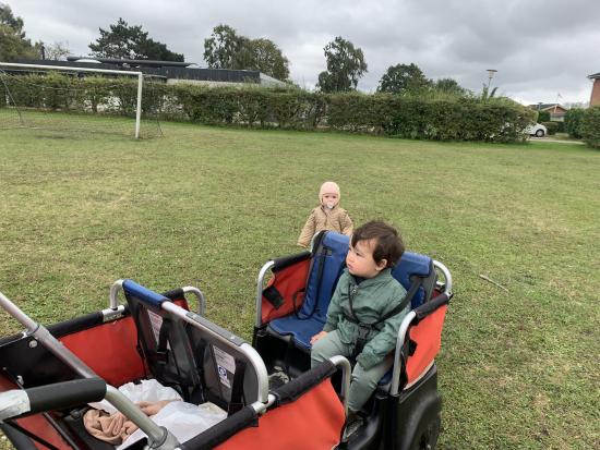 I dag har Neel, Lucca Villum og Vega leget ude på legepladsen sammen med Roseline. Vinden blæste kraftigt, men det gjorde bare legen endnu sjovere. Børnene hyggede sig med at gynge højt, suse ned ad rutsjebanen og mange andre sjove lege.