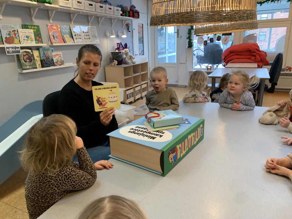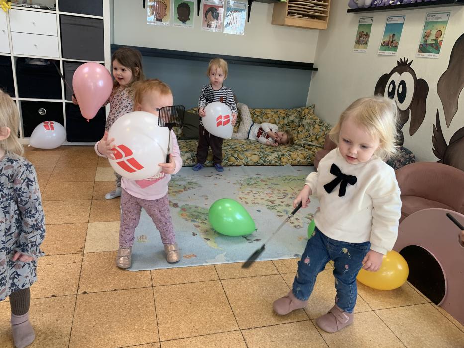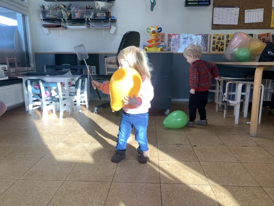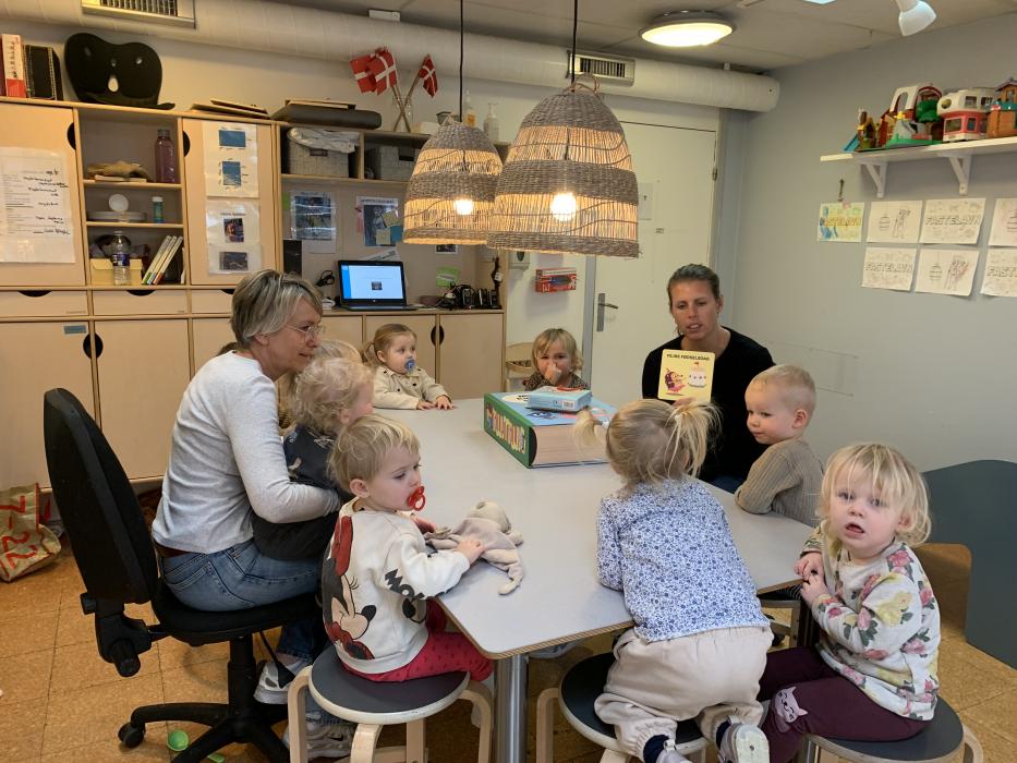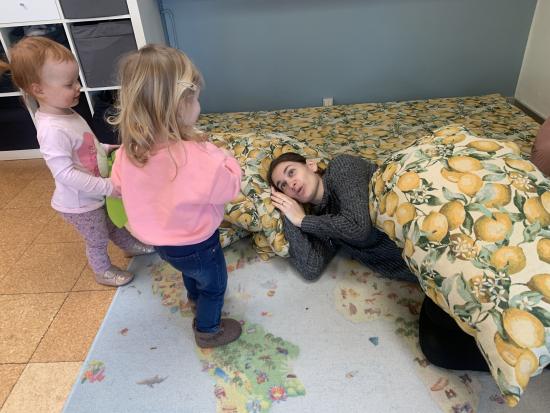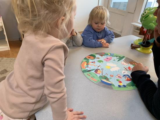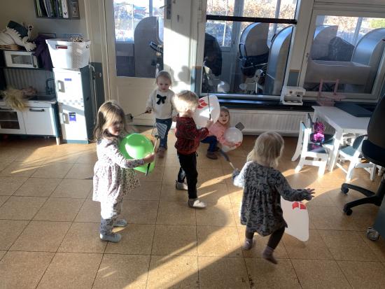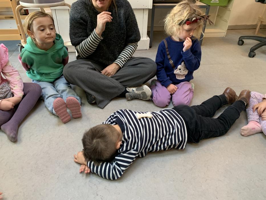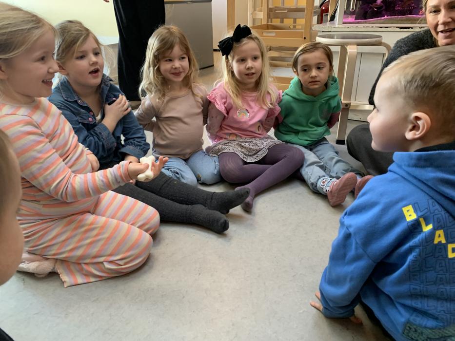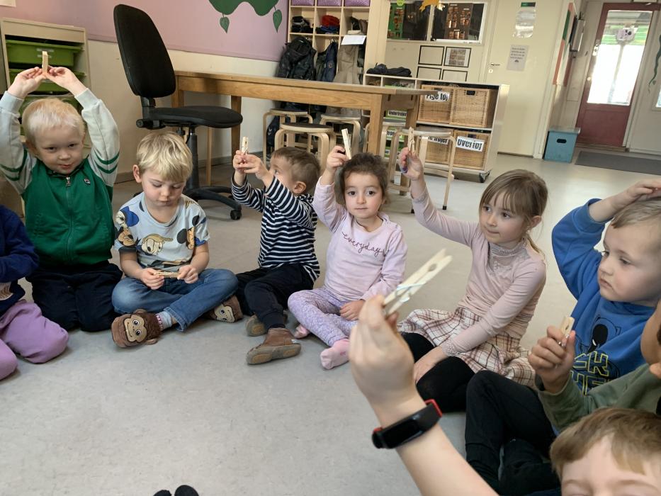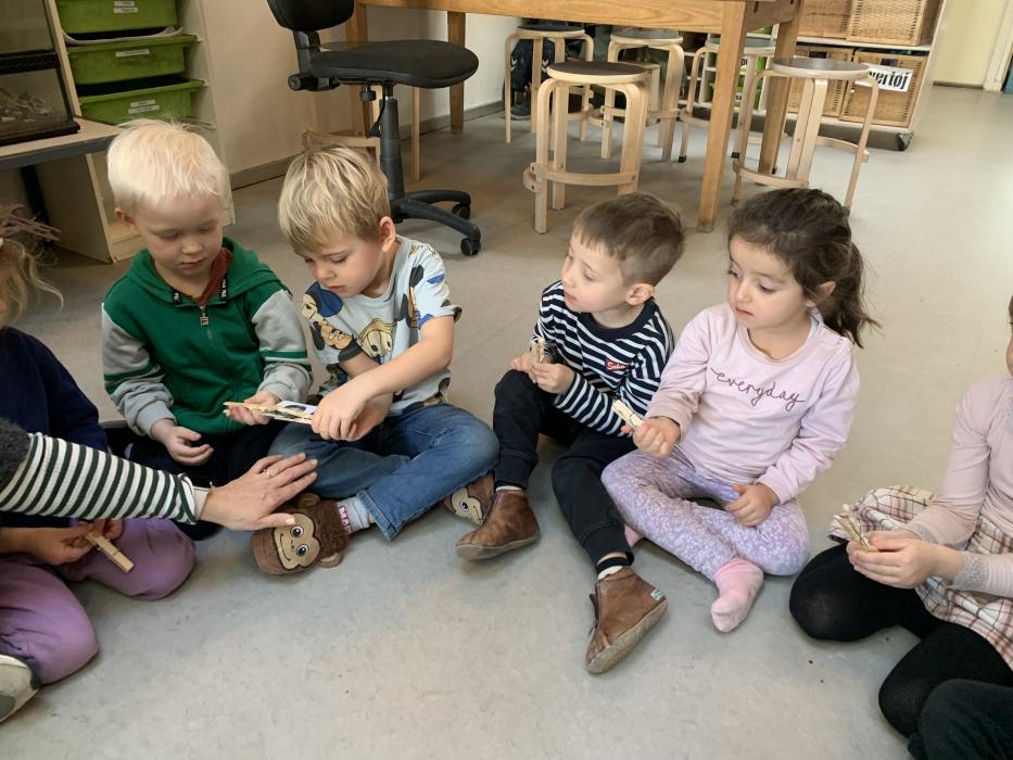 En gruppe børn fra Nattergalen og Elverhøj var samlet i fællesrummet til leg. Vi legede “Lille hund der er nogen der har taget dit kødben” - her skulle man øve sig i at bruge en anden sans end synet. Man skulle både lytte og mærke. Det var sjovt. Bagefter skulle vi øve lidt fin motorik ved at sende et billede videre til side kammeraten, kun ved at bruge en klemme. Der skulle vi øve os i at tale sammen og give klar besked om, hvornår man var klar til at slippe.