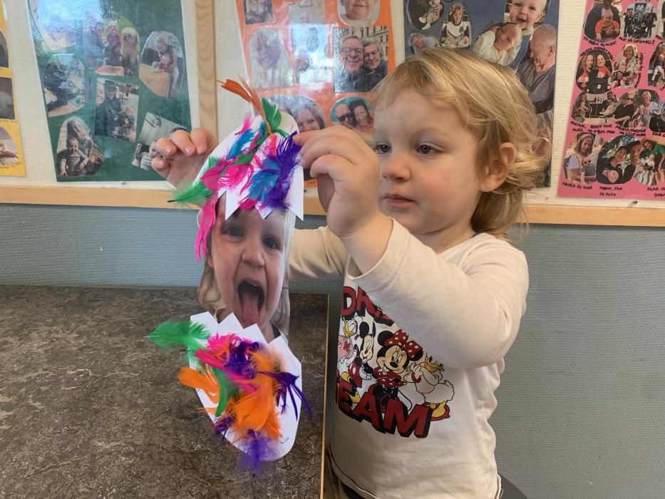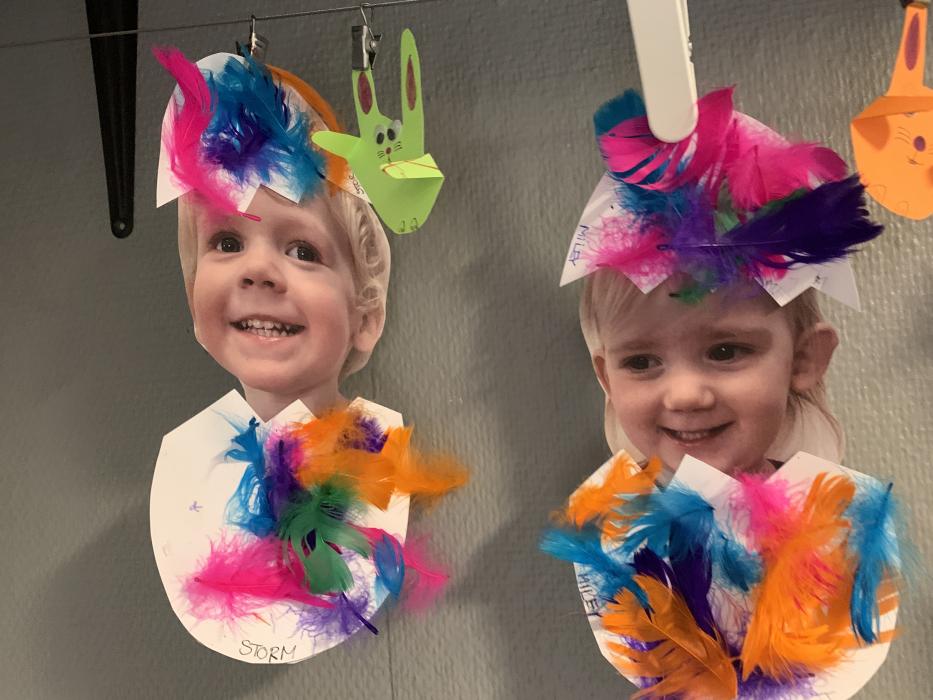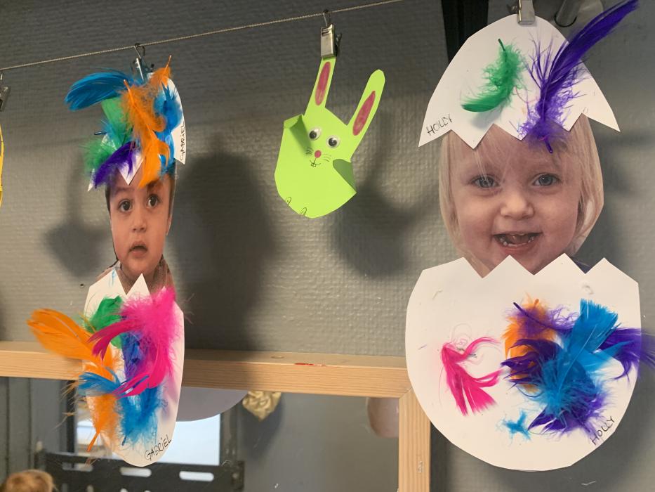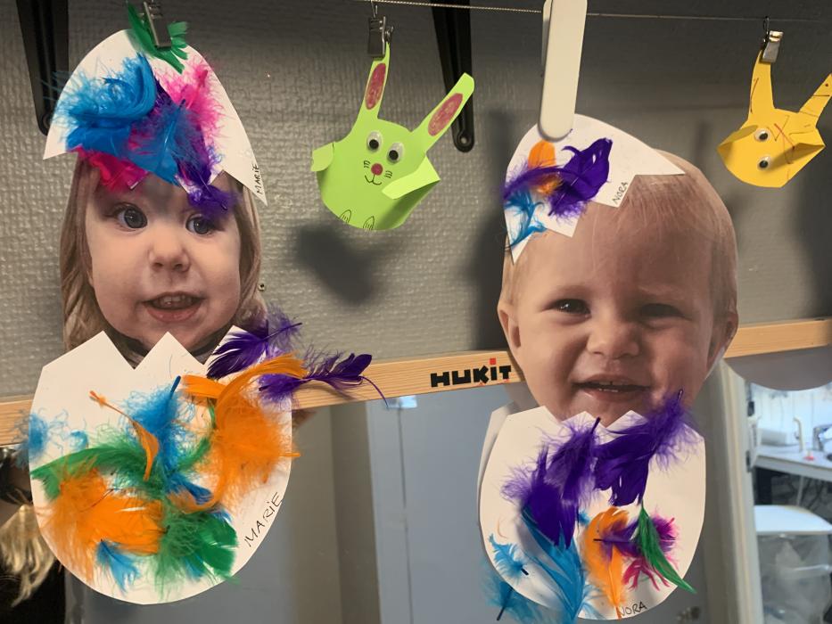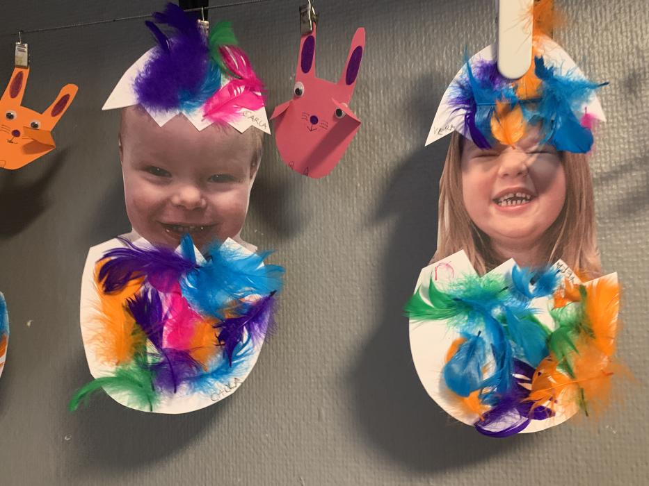 Vi har lavet flotte påskeæg med lim, fjer og billed af os selv. De hænger og pynter ved stuen så I kan se dem når I kommer i eftermiddag. Vi har også leget i skibet i fællesrummet, og danset til musik på stuen.