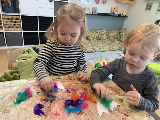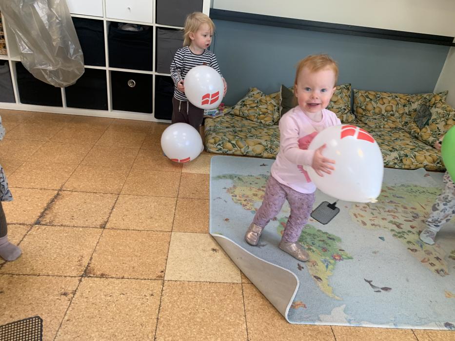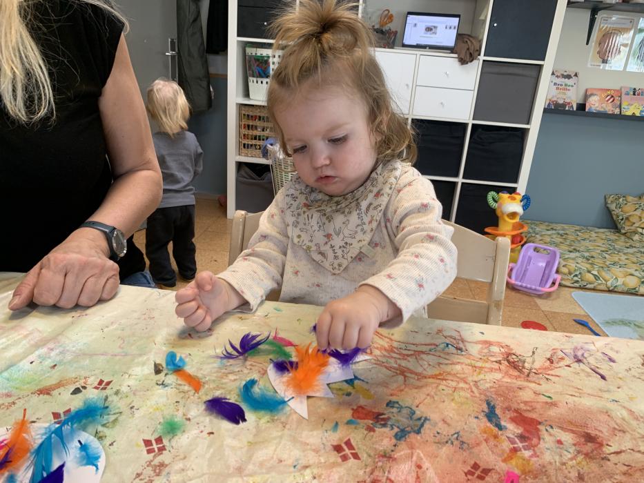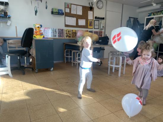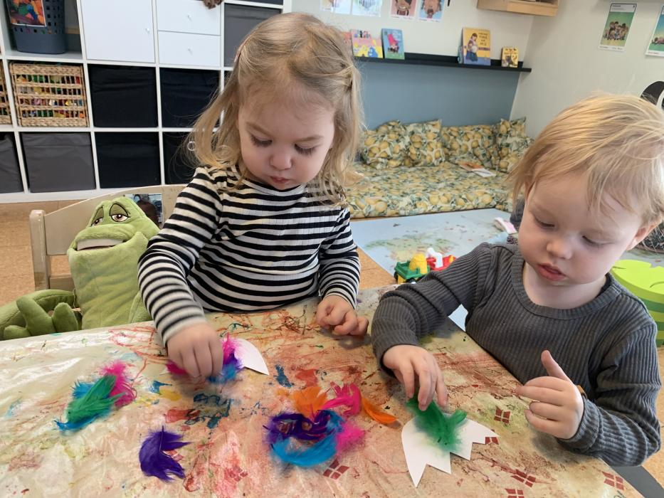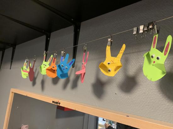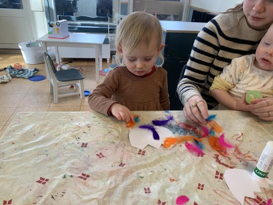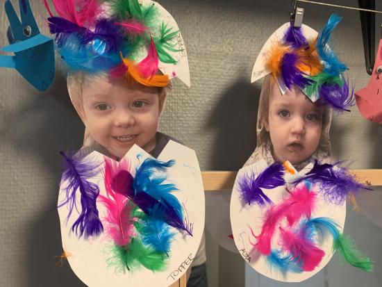 Vi har lavet flotte påskeæg med lim, fjer og billed af os selv. De hænger og pynter ved stuen så I kan se dem når I kommer i eftermiddag. Vi har også leget i skibet i fællesrummet, og danset til musik på stuen.