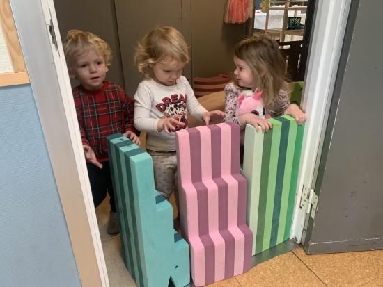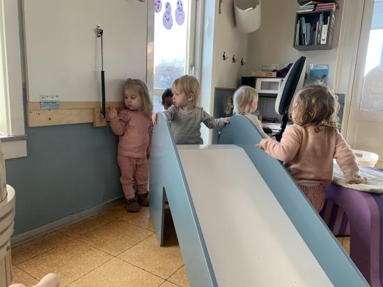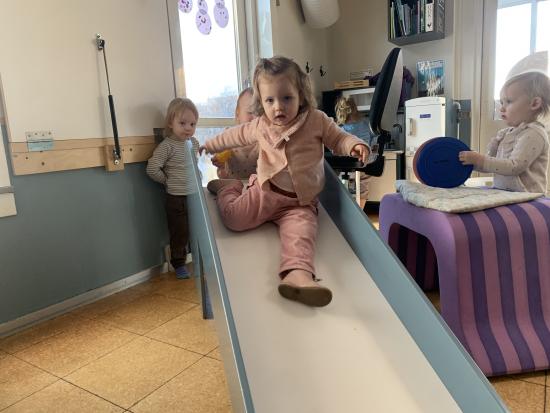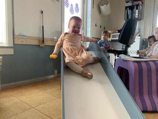 I dag har vi haft puder, bobles og rutsjebanen inde på stuen og tumlet rundt. Vi har især øvet at vente på tur til rutsjebanen. Det kan være lidt svært når det er så sjovt at rutsje, så det øver lidt.