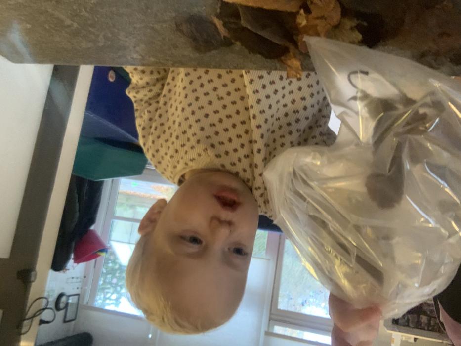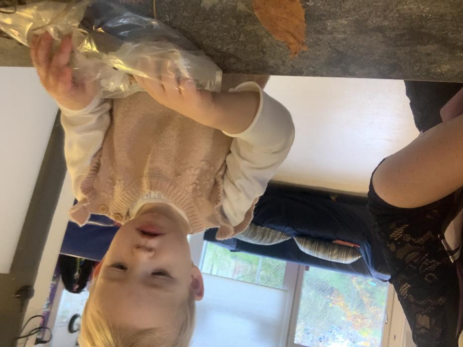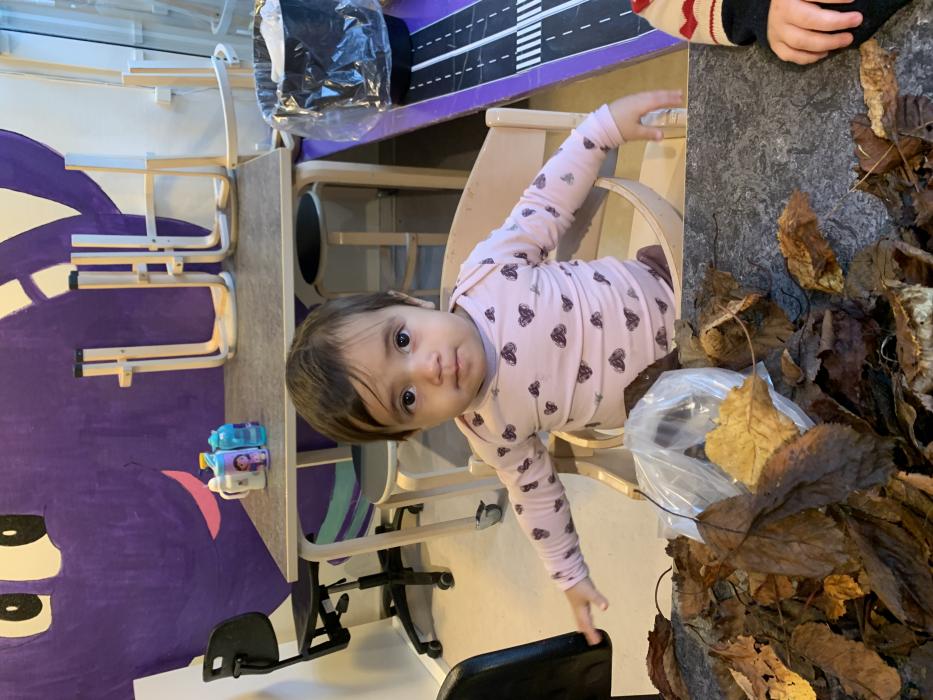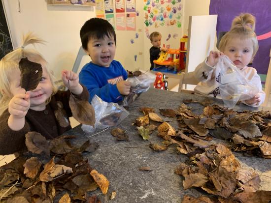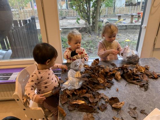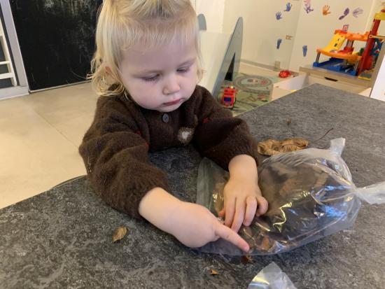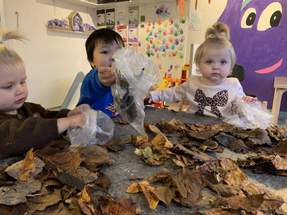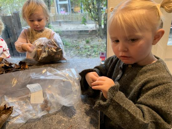 Vi har igen haft fat i bladene, som var blevet samlet fra naturen. I dag blev det til en sanse-kreativ oplevelse, da vi lavede poseugler. Børnene mærkede på bladene og puttede dem ned i poser. Børnene så ud til at have det sjovt og bladene blev puttet ned i posen og taget op et par gange.