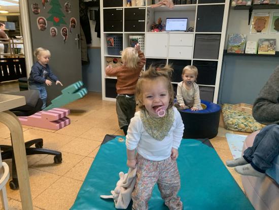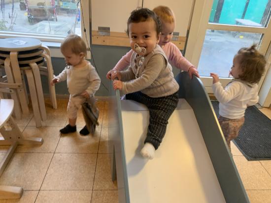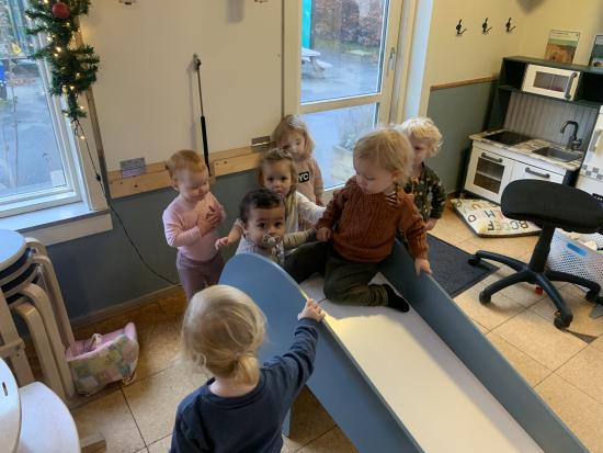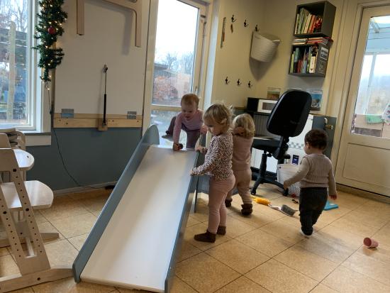 Inde hos os på Fyrtøjet er det første, der møder én 3 store søde hunde, der er malet på væggen. Vi har en stor rød bil, som børnene elsker at køre i, og så har vi forsøgt at skabe hyggekroge, som indbyder til leg.