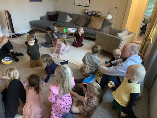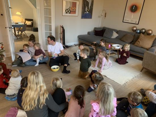 Til frokost fik vi risengrød med kanel og smørklat og til dessert fik vi banan muffin og citronmuffin. Vi sang fødselsdagssang og Folmer fik en rigtig flot tegning fra hele stuen.