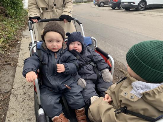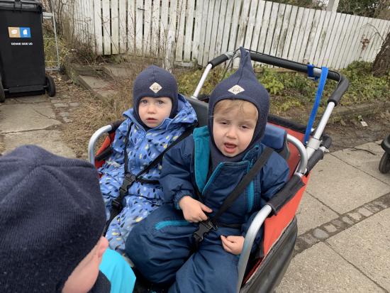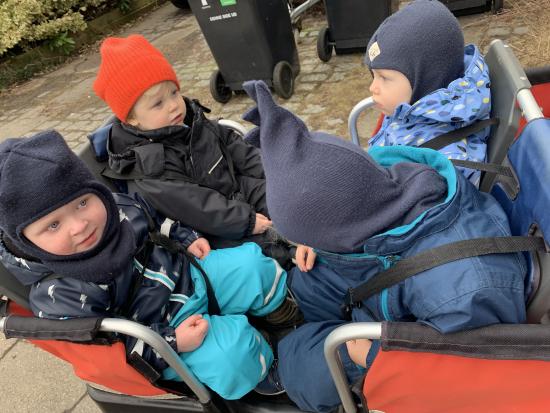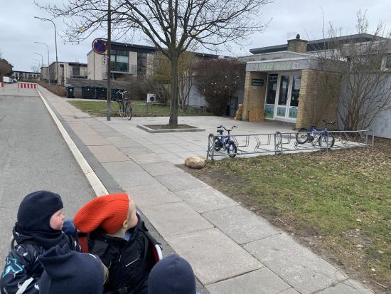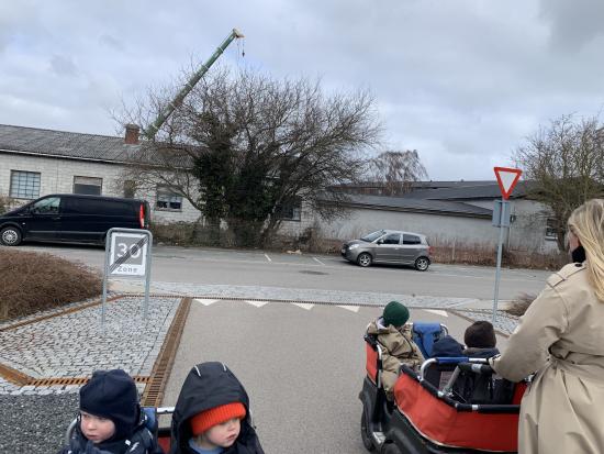 I dag har vi været ude og gå en tur i det blæsende vejr. Det var rigtig sjovt, og vi kunne mærke vinden ruske om os. Undervejs stødte vi på en stor kran, som vi kiggede nærmere på, den var virkelig stor!