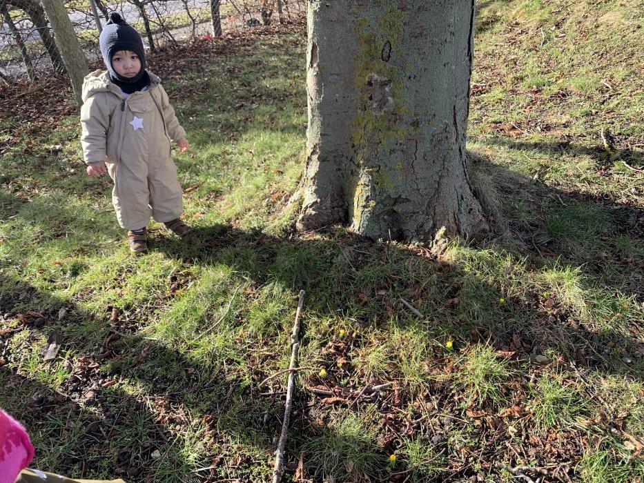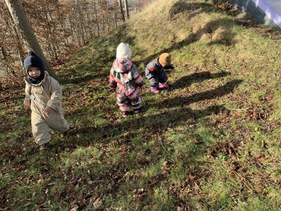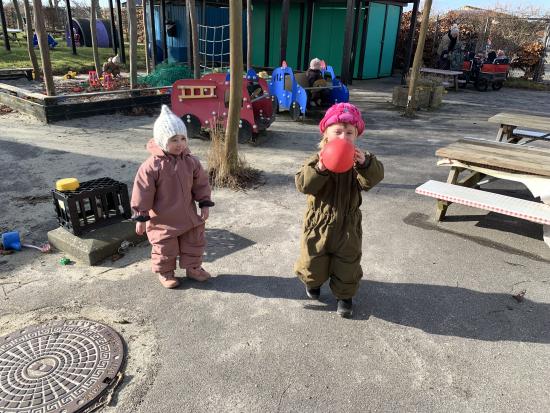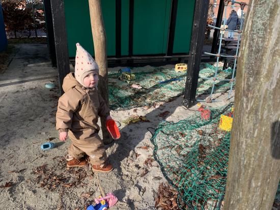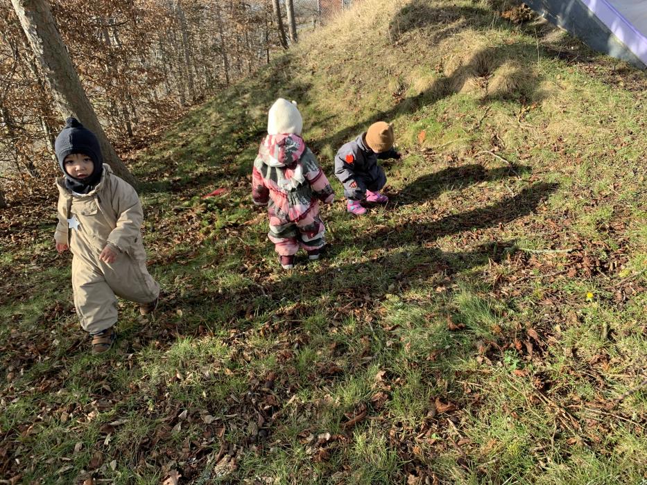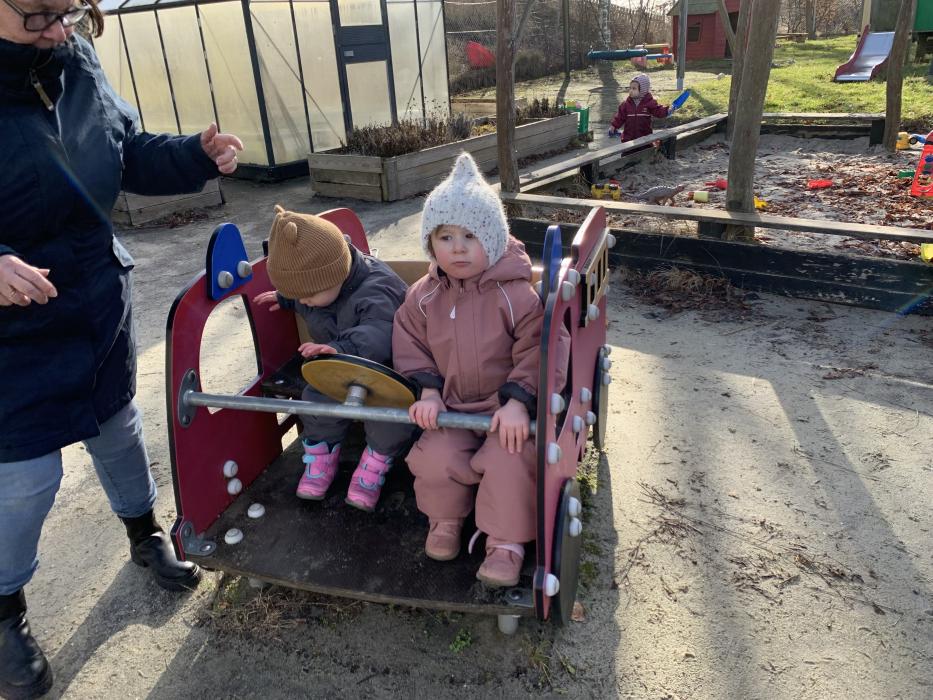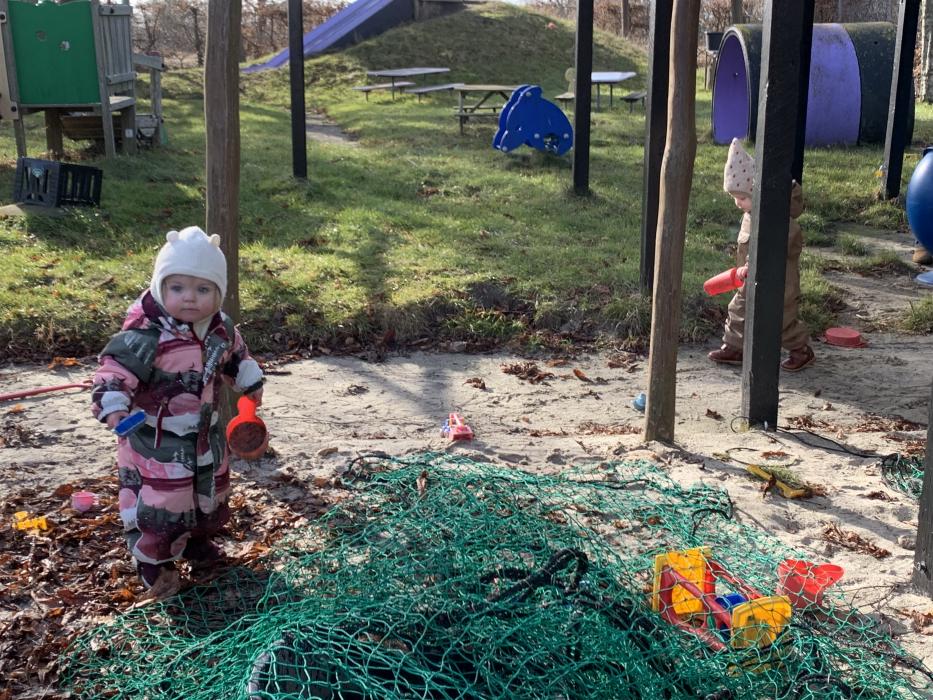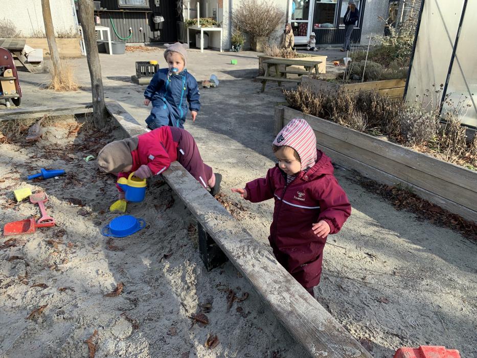 Vi nyder at være udenfor på vores skønne legeplads, hvor der bliver gynget, rutsjet, kørt på scootere og leget i sandkassen. Et par gange om ugen går vi også ture i nærmiljøet.